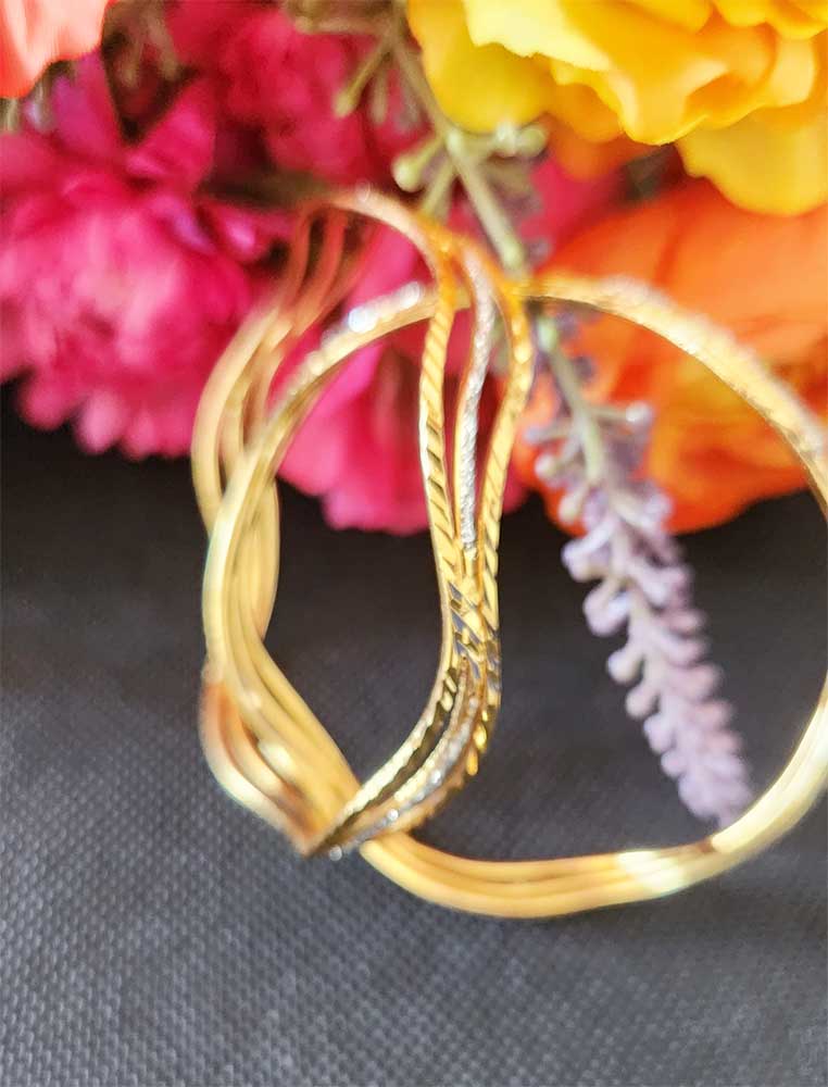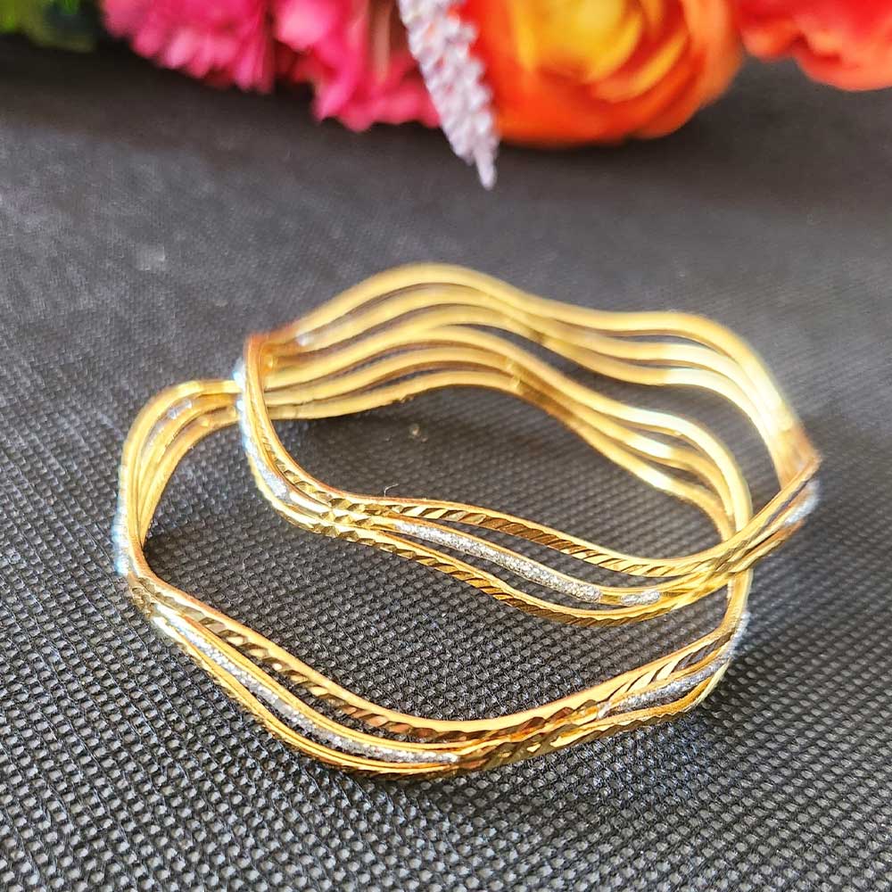 This is a set of 2 gold finish bangles that will make a perfect accessory for any traditional attire. The simple wavy design and gold finish gives an elegant look that will elevate your look. The bangles are lightweight and comfortable to wear, making them the perfect accessory for any traditional look.