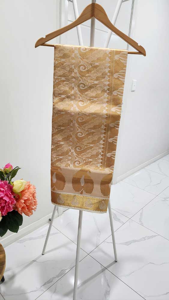 This elegant Kerala saree is crafted from cotton silk and is adorned with beautiful golden thread work in the pallu and border. The rich cream color gives it a luxurious look, making it perfect for traditional ceremonies and puja. The saree also comes with a beautiful stitched blouse, making it a perfect combo offer.