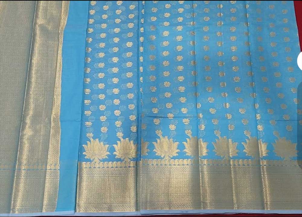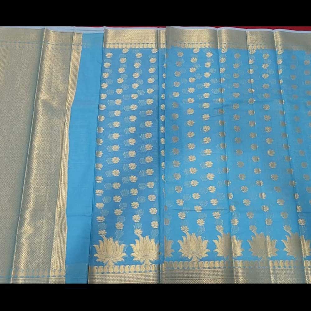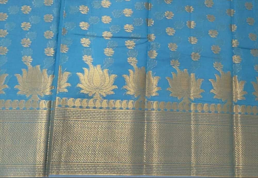 This stunning light blue tussar silk saree is perfect for any festive occasion. It features beautiful lotus-shaped gold thread work and a broad golden border and pallu. With a high-quality fabric and a complimentary blouse piece, this saree is the perfect choice for any special occasion.