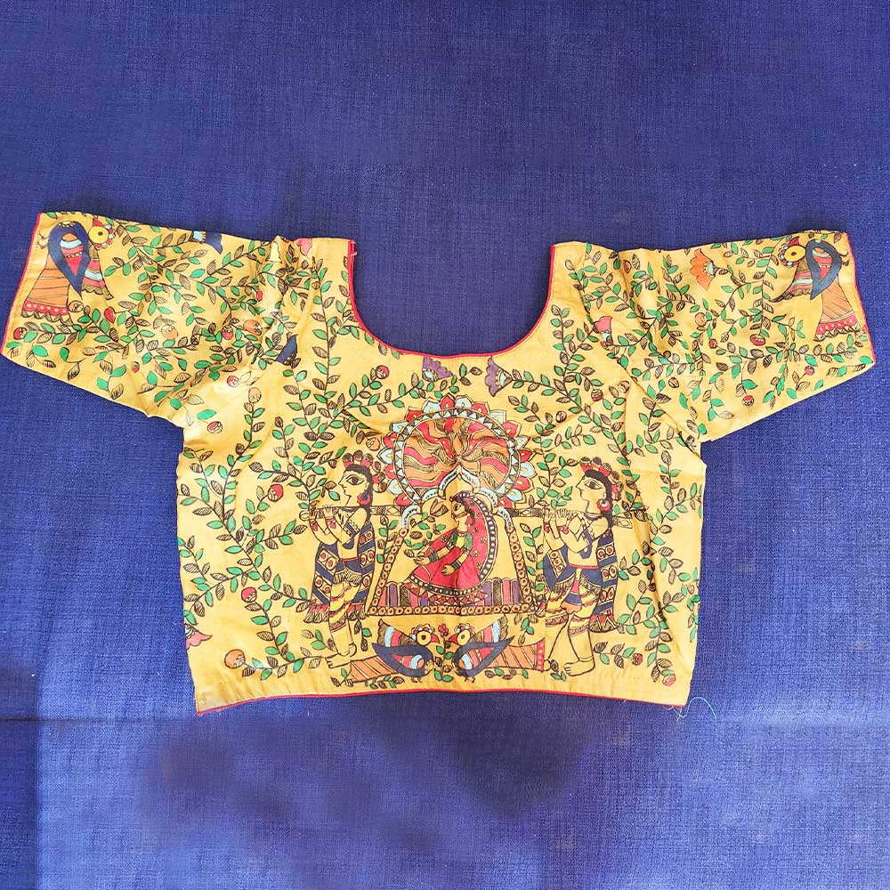 This beautiful Madhubani Stitched blouse is the perfect addition to any wardrobe. Crafted from luxurious silk, it features a stunning mustard yellow colour with a beautiful design of a girl in a doli on the front and and bird on a tree at the back. Handcrafted by skilled artisans, this blouse is sure to be a conversation starter. It is the perfect way to add a little bit of cultural flair to your look
