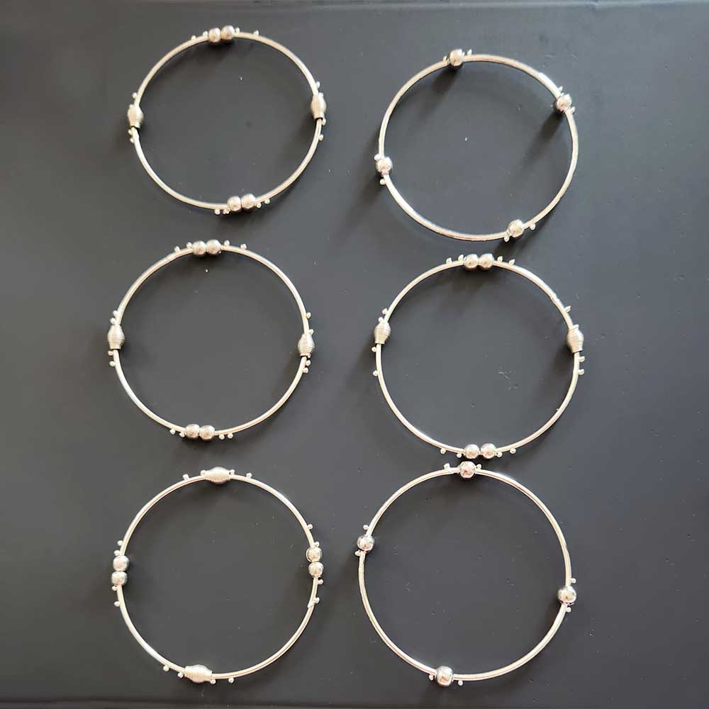 This gorgeous set of 6 silver bangles is the perfect accessory for any occasion. Crafted with a simple and elegant design, these bangles feature delicate silver beads to create a subtle shimmer. Lightweight and comfortable to wear, these bangles are the perfect addition to any outfit for a trendy and stylish look.